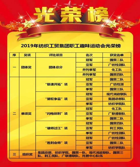 經(jīng)過緊張激烈的幾輪比拼后,國貿(mào)二隊(duì)、廣紡檢測隊(duì)、廣州化工隊(duì)和國貿(mào)四隊(duì)分別榮獲團(tuán)體總分冠、亞、季軍(并列);國貿(mào)二隊(duì)、現(xiàn)代潤政聯(lián)隊(duì)、廣州化工隊(duì)、國貿(mào)四隊(duì)、廣紡檢測隊(duì)等代表隊(duì)喜摘5個(gè)單項(xiàng)冠軍;集團(tuán)總部隊(duì)等8支隊(duì)伍獲得優(yōu)秀組織獎(jiǎng)。(詳細(xì)獲獎(jiǎng)名單見文末光榮榜)