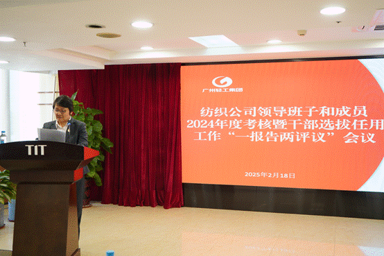 2月18日下午,紡織公司黨委召開領導班子和成員2024年度述職暨干部選拔任用工作“一報告兩評議”會議。會議由公司黨委副書記、工會主席丘海瀾主持。紡織公司領導班子成員、中層管理干部、公司“一代表兩委員”以及黨員干部群眾代表參加了會議,廣州輕工集團紀檢監察室派員出席了會議。