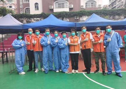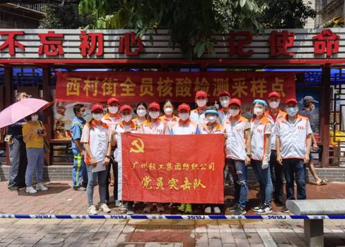 周遜姜同志(右四)帶領(lǐng)廣紡聯(lián)志愿者在核酸檢測(cè)現(xiàn)場(chǎng)