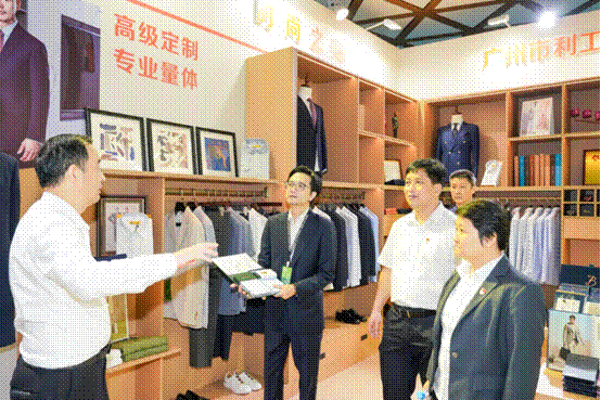 在共建活動中,大家來到廣東時裝周的利工民主題展位前,深入了解利工民服裝定制業務開展情況。廣東省服裝服飾行業協會黨支部書記劉岳屏介紹了目前廣東服裝定制的整體情況以及相關智能制造企業情況。雙方就如何加強資源共享,促進服裝定制服務做強做大,助力廣東定制“出圈”“破圈”進行了交流探討。